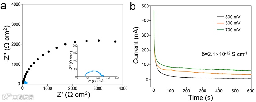 图3 .(a)组装的Na/NYS/Na和Na/MCL@NYS@MCL/Na对称电池的电化学阻抗谱。插图是Na/MCL@NYS@MCL/Na的放大阻抗曲线;(b)Pt/MCL@NYS@MCL/Pt电池在300、500和700 mV的电流-时间曲线。