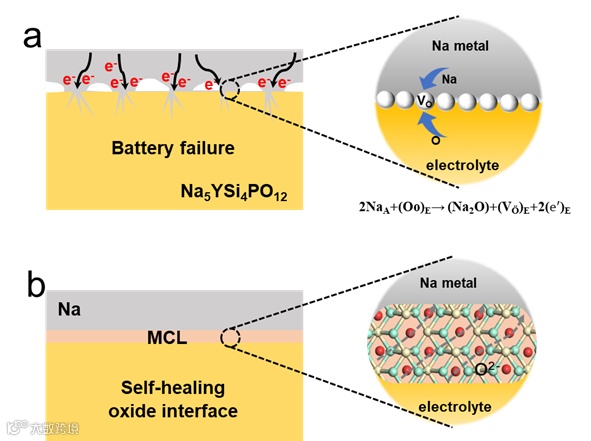 图1. (a)金属钠和NYS间的不良接触导致严重的副反应。(b)CGO的引入可以有效地调节界面氧势,并均匀化界面场分布,有效抑制界面副反应和钠枝晶的产生。