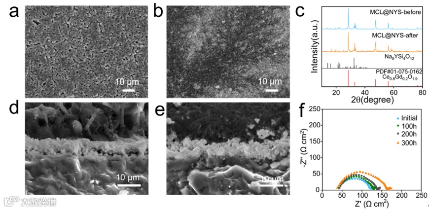 为了进一步验证MCL对金属钠与电解质间界面稳定性的影响,研究人员对MCL修饰电池循环前后的界面形貌进行了表征。如图4a所示,MCL修饰电池,即使在电池循环100个小时后其表面也没有发生明显的变化。而未经修饰的电池在经过50个小时的小电流循环后,表面发生了严重的副反应,受到不可逆转的损伤(图4b)。XRD测试结果同样表明,在MCL修饰电池在循环50个小时后,电解质的衍射峰没有发生明显变化,证明了其界面具有良好的稳定性。图4d和图4e分别是由MCL@NYS电解质组装的对称电池在循环50个小时前/后的截面SEM图,金属钠与电解质间始终保持了紧密接触。同时,即使在循环300小时后的电池的阻抗没有发生明显改变,表明界面具有出色的稳定性。