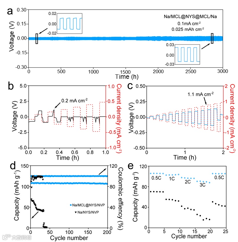 为了评估MCL界面层对阳极界面性能的改善,研究人员对循环前后界面阻抗进行了测试。如图3a所示,相比于未经界面修饰的电池,经过MCL修饰的电池界面电阻要小60倍以上,仅为43.18 Ω cm2。此外,DC极化曲线测试结果表明,MCL修饰电解质的电子导率相比空白电解质降低了一个数量级,可以有效地阻碍界面处的电子传导,抑制钠枝晶的产生。