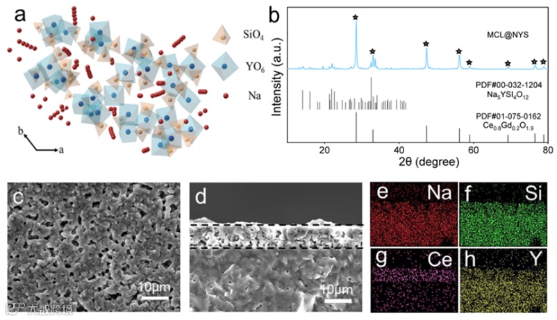 通过高温固相法合成的NYS电解质的晶体结构如图2a所示。通过使用丝网印刷法将氧离子导体CGO和钠离子导体NYS的混合浆料涂覆在电解质表面经煅烧得到混合导体界面层(MCL),制备的MCL界面层致密且厚度约为6μm,EDS光谱测试结果表明MCL界面层中的元素(Na、Si、Ce、Y)分布均匀(图2e-h)。这些测试结果证明MCL界面层得以成功构建。