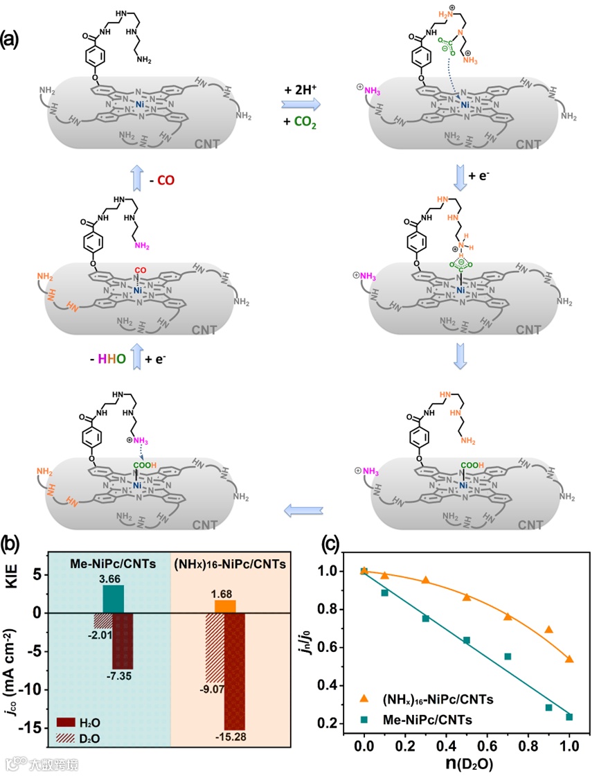 具体地,所制备的(NHx)16-NiPc/CNTs在CO2-to-CO转化方面具有优异的电催化性能,具有~100%的FECO,工业兼容的大电流密度和在宽电位窗口中具有出色的耐久性。同时,通过详细的氘代动力学同位素效应实验和质子库存实验,剖析了胺基链在eCO2RR中的“质子摆渡”效应,揭示了局域微环境的促进机理和协同机制。