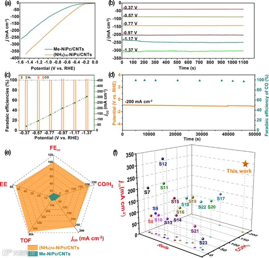 在流动电解槽中将(NHx)16-NiPc/CNTs作为双功能电催化剂,开发了一种低电能输入的整体CO2电解系统,将阴极eCO2RR与阳极氧化反应耦合,实现了大电流密度下同步产生CO原料气和硫粉回收,示范了一种工业运行的概念平台。