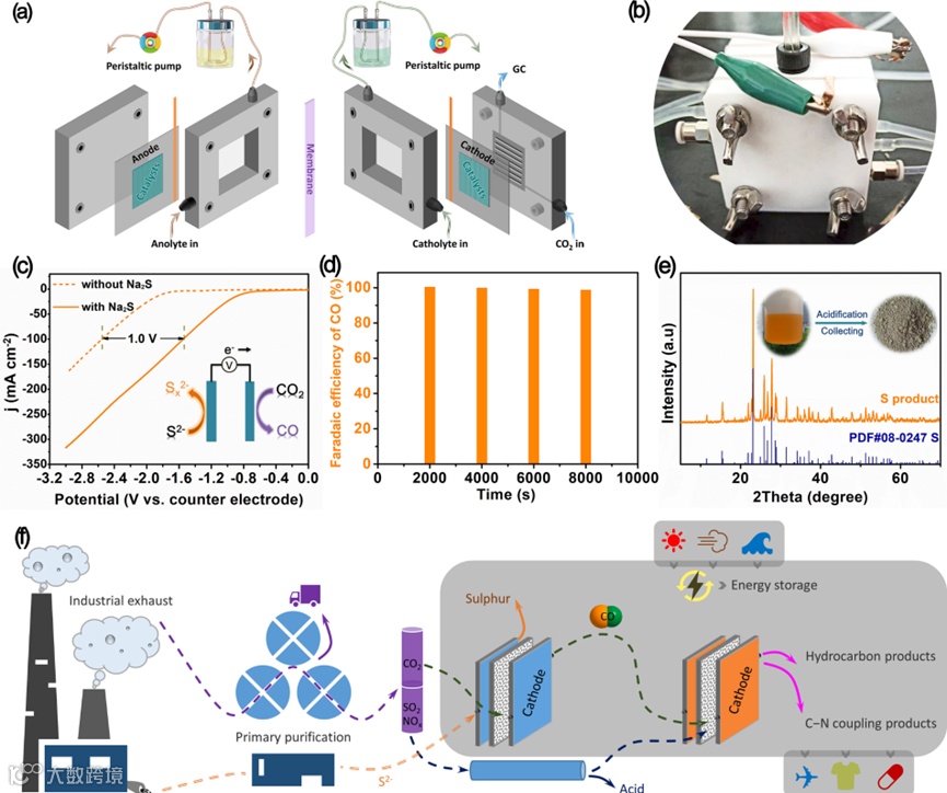 此外,通过在流动电解槽中构建共电解体系,实现了阴极高活性CO2-to-CO转化与阳极硫离子氧化的巧妙结合,从而完成了低能耗驱动下的高附加值工业原料生产和能源储存。