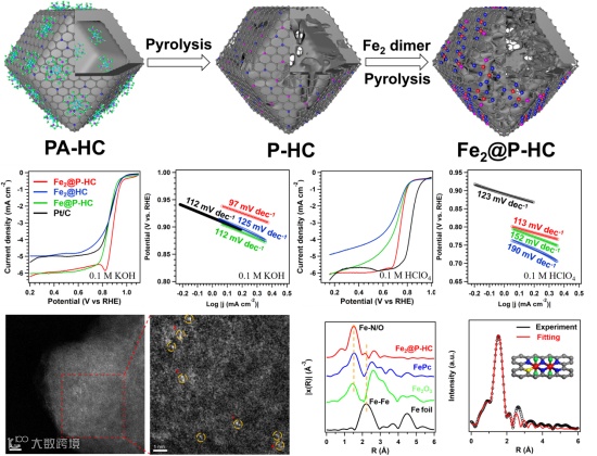 以ZIF-8为模板,将Tp和Bpy在ZIF-8上聚合,合成具有TpBpy-COF的COF@MOF。然后在800℃下热解得到具有中空结构的COF@MOF800。浸泡植酸后,在900℃下进一步碳化1 h,得到磷掺杂的中空碳。通过浸渍法将铁二聚体吸附在中空碳的表面和空腔内。最后,在950℃下热解得到Fe2@P-HC催化剂。