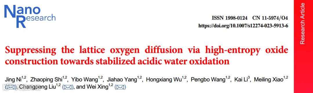 Ni J, Shi Z, Wang Y, et al. Suppressing the lattice oxygen diffusion via high entropy oxide construction towards stabilized acidic water oxidation. Nano Research, 2023, https://doi.org/10.1007/s12274-023-5913-6