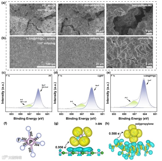 图3 Na-DTT电池循环100圈后金属钠负极的SEM图像(a)使用h-BN@PP@C,(b)PP 隔膜;金属钠负极的XPS光谱:(c)PP,(d)C@PP和(e)h-BN@PP@C隔膜;PF6-在 h-BN 影响下(f)键长和(g)电荷密度的变化;PF6-在聚丙烯(PP 隔膜)影响下(h)电荷密度的变化