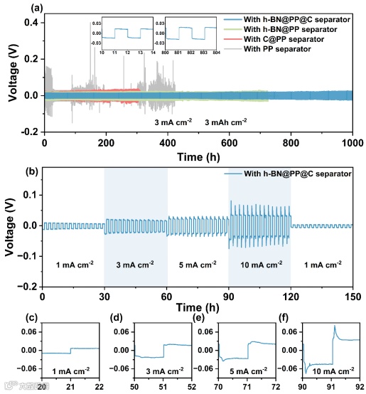 图2 (a)使用PP、h-BN@PP、C@PP、h-BN@PP@C隔膜的Na//Na对称电池在3 mA cm-2、3 mAh cm-2电流密度下的循环性能图;(b)不同电流密度下(mA cm-2, mAh cm-2)h-BN@PP@C隔膜对称电池的循环稳定性测试;(c-f)不同电流密度下的相应放大图