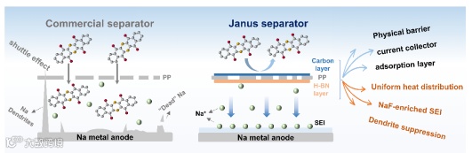 近日,来自新疆大学的贾殿赠、王省超团队在国际知名期刊Advanced Functional Materials上发表题为“Combining Janus Separator and Organic Cathode for Dendrite-Free and High-Performance Na-Organic Batterie”的研究论文。该文章提出了一种使用(六方氮化硼)h-BN和碳材料在聚丙烯(PP)上构建的Janus隔膜(h-BN@PP@C),同时解决了困扰SOBs的有机正极溶解、穿梭和钠负极枝晶等问题。