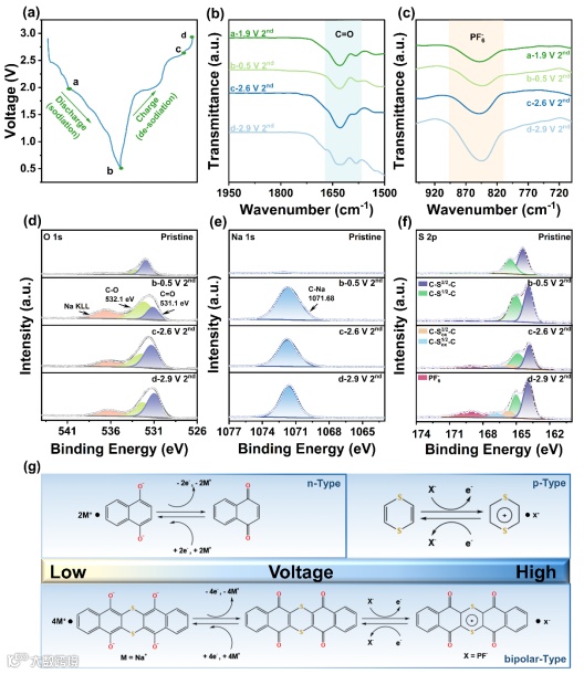 图4 (a)电流密度200 mA g-1下Na-DTT电池充放电曲线;不同下充放电状态下的非原位FTIR光谱:(b)C=O键,(c)PF6-;非原位XPS光谱:(d)O 1s光谱,(e)Na 1s光谱,(f)S 2p光谱,(g)DTT的结构和储能机制