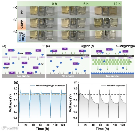 图4(a)PP、(b)C@PP和(c)h-BN@PP@C隔膜DTT在DME中的穿梭对比;使用(d)PP,(e)C@PP和(f)h-BN@PP@C隔膜的Na-DTT电池循环过程示意图;使用(g)h-BN@PP@C,(h)PP隔膜的Na-DTT电池自放电性能
