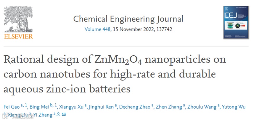 本文中,南京工业大学张翼副教授课题组在国际知名期刊Chemical Engineering Journal上发表题为“Rational design of ZnMn2O4 nanoparticles on carbon nanotubes for high-rate and durable aqueous zinc-ion batteries”的研究工作。