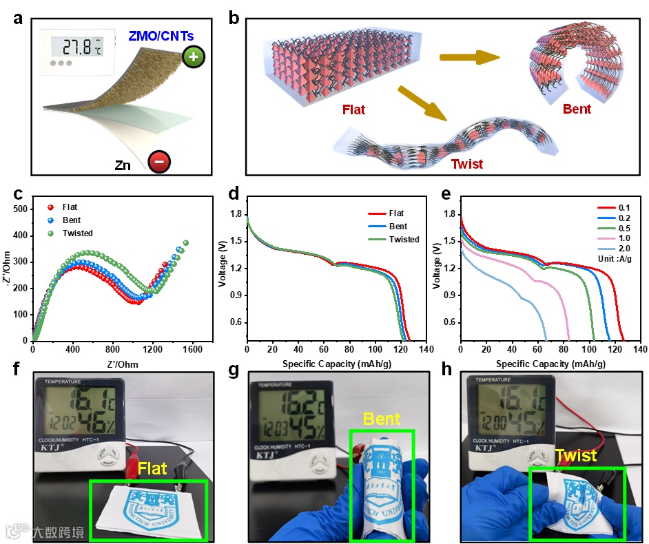 (a)柔性锌离子电池示意图。(b)ZMO/CNTs材料在不同弯曲状态下的示意图。柔性锌离子电池在不同弯曲状态下的(c)EIS图;(d)100 mA g-1下的放电曲线。(e)柔性电池平坦状态不同电流密度下的放电曲线。(f-h)柔性电池在不同状态下的工作展示。