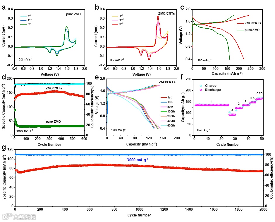 (a)ZMO和(b)ZMO/CNTs电极的CV曲线。ZMO和ZMO/CNTs电极的(c)充放电曲线;(d)1 A g-1下的循环性能图。ZMO/CNTs电极(e)1 A g-1下不同圈数的充放电曲线;(f)倍率性能图;(g)3 A g-1下的循环性能图。