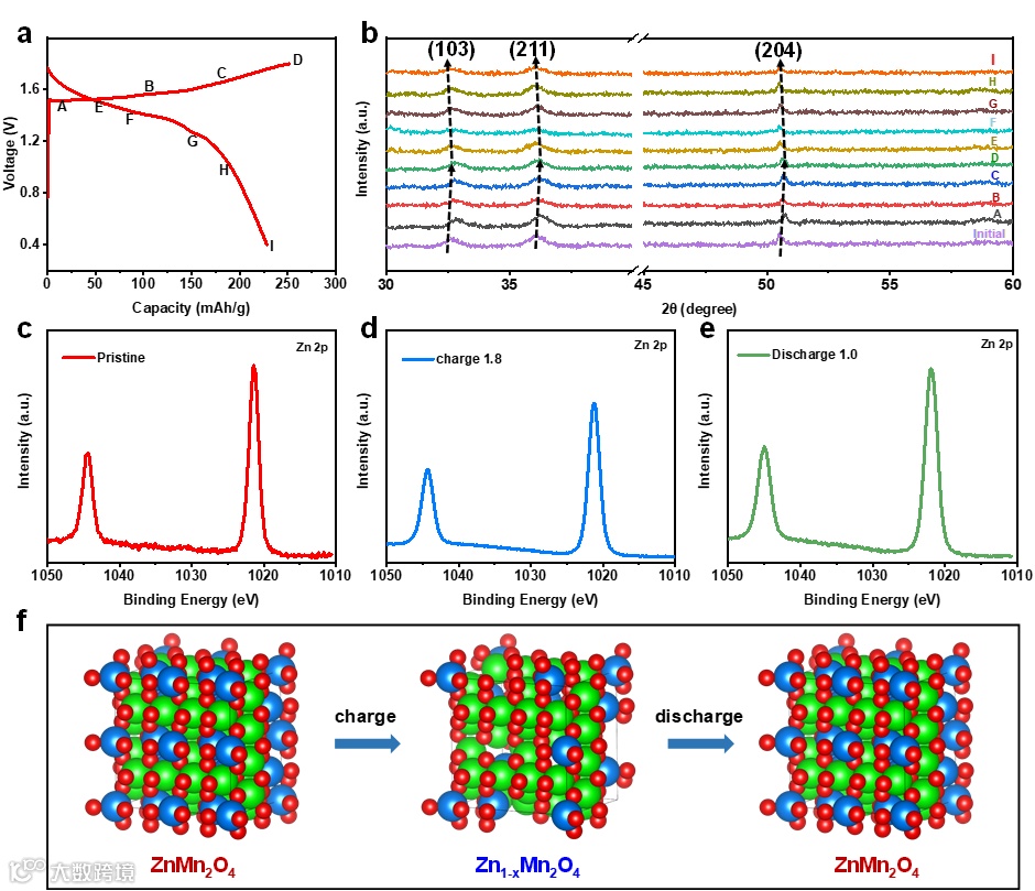 ZMO/CNTs电极(a)100 mA g-1下的充放电曲线;(b)非原位XRD图谱;(c-e)不同充放电状态下的高分辨Zn 2P XPS光谱;(f)电化学储能机理示意图。