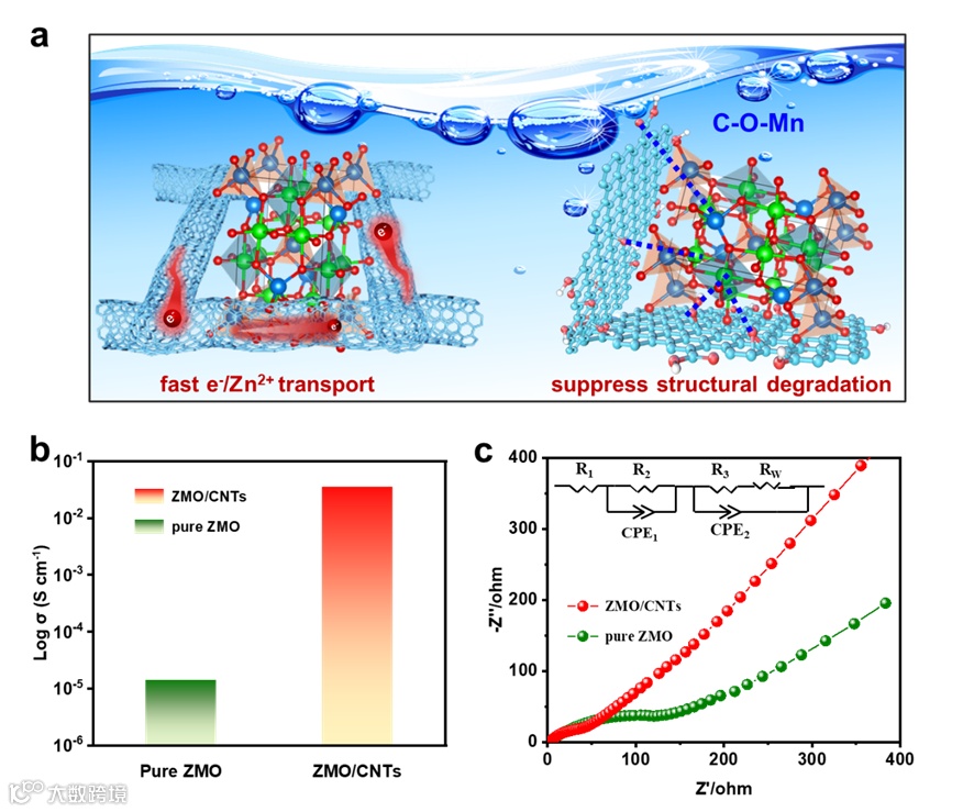 (a)ZMO/CNTs正极材料高导电性和结构稳定性的机制。(b)ZMO和ZMO/CNTs样品的电导率。(c)ZMO和ZMO/CNTs的EIS图。
