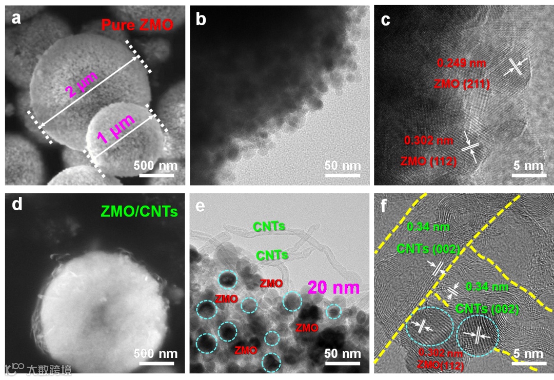 ZMO样品的(a)SEM图像;(b)TEM图像;(c)HRTEM图像。ZMO/CNTs样品的(d)SEM图像;(e)TEM图像;(f)HRTEM图像。