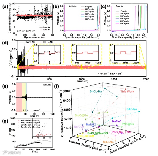 图3. a)在电流密度为2mA cm−2和容量为2mA h cm−2的非对称电池的库仑效率以及相应的b)IOHL-Na和c)裸Na在Cu箔上首次、100次、200次、300次、400次和500次循环的电压曲线。d)在4mA cm−2和4mA h cm−2电流密度下IOHL-Na和裸Na的恒电位剥离/沉积曲线以及局部放大图。e)IOHL-Na在1mA h cm−2容量下的倍率性能。f)对称IOHL-Na电池与近期文献中关于电流密度、面容量和累积容量的比较。g)循环前和50次循环后对称电池的阻抗图。