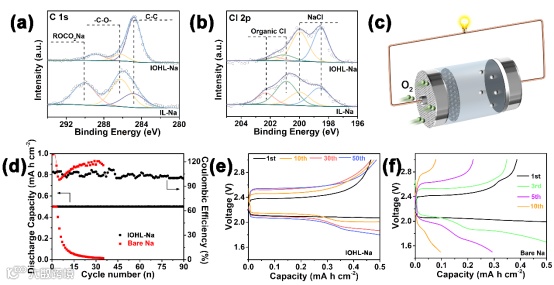 图4. a)IL-Na和IOHL-Na在100次循环后C 1s和b)Cl 2p的高分辨率XPS光谱对比。c) IOHL-Na∣CNT/CP Na-O2电池的示意图。d) Na-O2电池在0.5mA cm−2电流密度下的充放电性能。e)IOHL-Na∣CNT/CP Na-O2电池和f)裸Na∣CNT/CP Na-O2电池在不同循环次数下的充放电曲线。