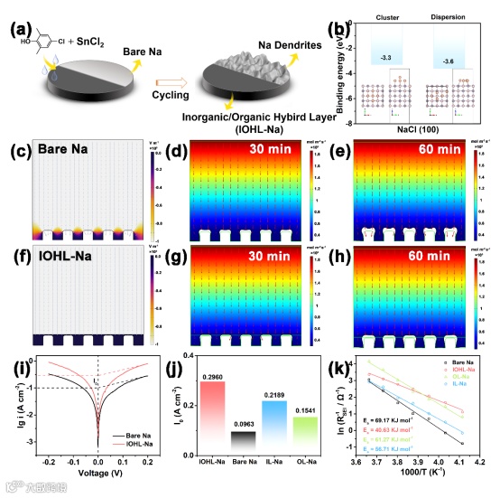 图2. a) IOHL-Na制备过程的示意图。b) Na5团簇和五个单独的Na原子在NaCl表面上的结合能与吸附位点。c)裸Na和f) IOHL-Na的电场模拟。在恒定扩散时间为30和60 min时,d,e)裸Na和g,h) IOHL-Na的Na+浓度场。i) IOHL-Na和裸露的Na的塔菲尔图谱(Tafel图)和j)计算得到的交换电流密度(I0)。k) Na+通过SEI扩散的活化能计算。