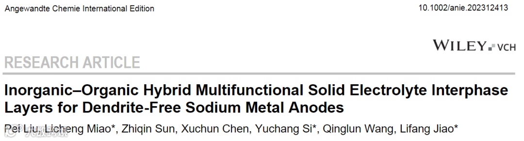 近日,南开大学的焦丽芳教授在国际知名期刊 Angewandte Chemie International Edition上发表题为“Inorganic–Organic Hybrid Multifunctional Solid Electrolyte Interphase Layers for Dendrite-Free Sodium Metal Anodes”的文章。作者设计了一种无机/有机混合多功能固体电解质界面以有效地增强金属钠负极的稳定性。无机和有机组分的协同作用可以互相取长补短,实现在大电流密度下具有长循环寿命的无枝晶钠金属电池。该工作为构建高耐久性SEI和无枝晶钠金属电池提供了一种新策略。