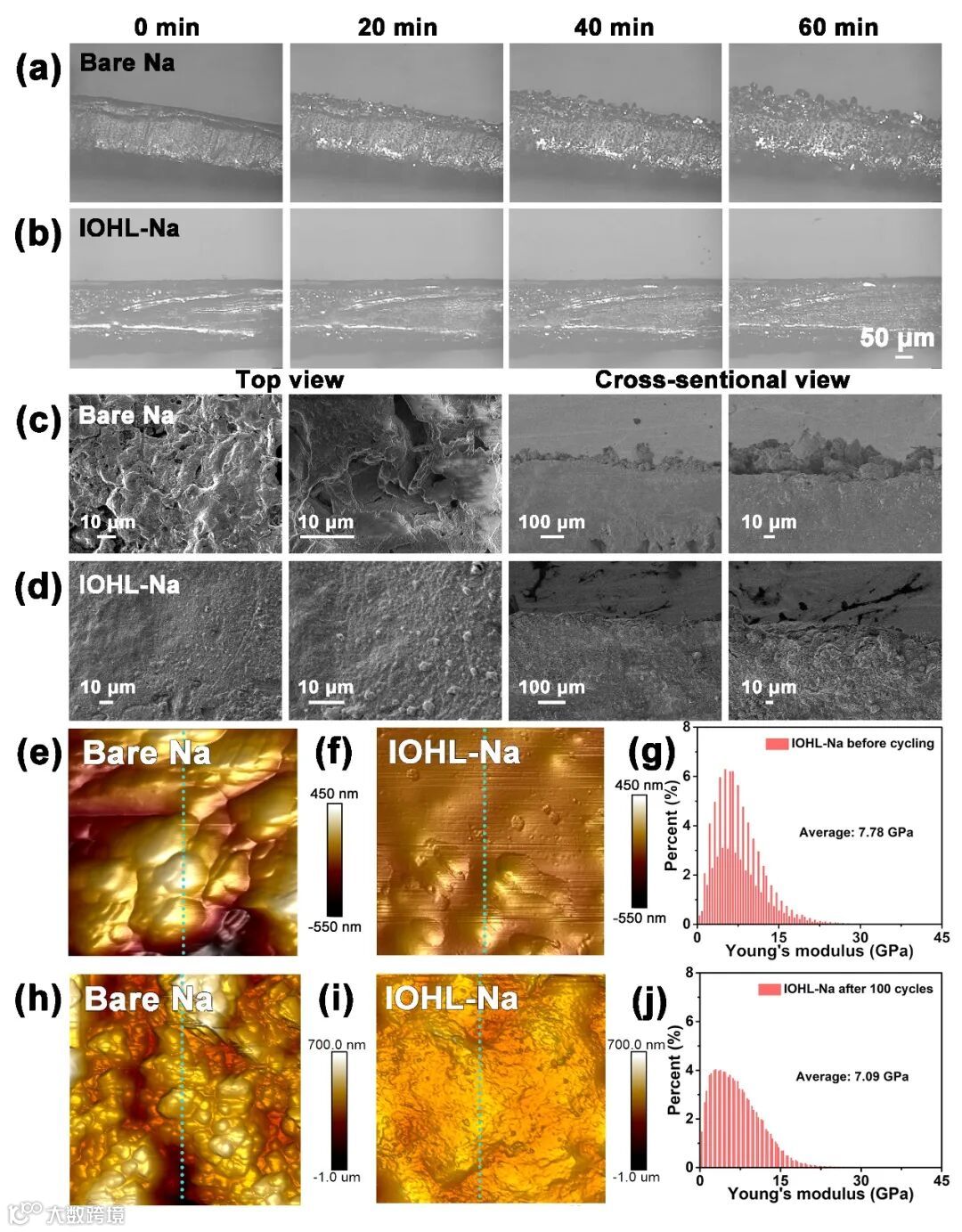 图5. a)裸Na和b) IOHL-Na在2mA cm−2电流密度下的原位光学显微镜图像。c)裸Na和d) IOHL-Na在1mA cm−2和1mA h cm−2循环100次后的顶部和横截面扫描电子显微镜图像。e)裸Na和f) IOHL-Na循环前3D AFM表面形貌图像。g) IOHL-Na中杨氏模量的相应直方图。h)裸Na和i) IOHL-Na在1mA cm−2和1mA h cm−2循环100次后的3D AFM表面形貌图像。j) IOHL-Na中杨氏模量的相应直方图。
