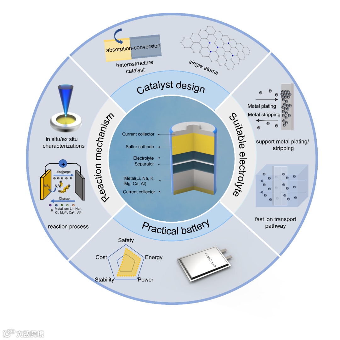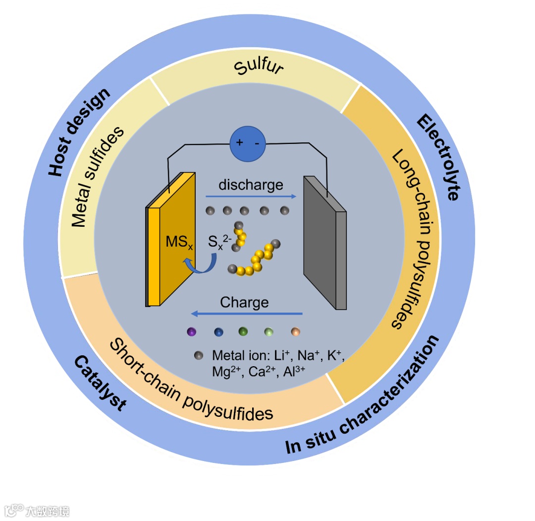 该综述探索了硫在各种金属硫电池(包括Li-S, Na-S, K-S, Mg-S, Ca-S, Al-S)体系中的衍变过程,并且从电解液,电极结构和催化剂等方面总结了对硫衍变过程中的调控(例如:抑制穿梭效应,提高反应动力学),同时探讨了原位表征技术(例如:原位TEM,原位XRD)对反应机理的探索。