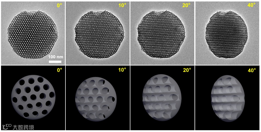 Figure 4. Tilt angle TEM images of a Pt NP-loaded MCMP and corresponding 3D cartoons showing the orientation of pore pathways.