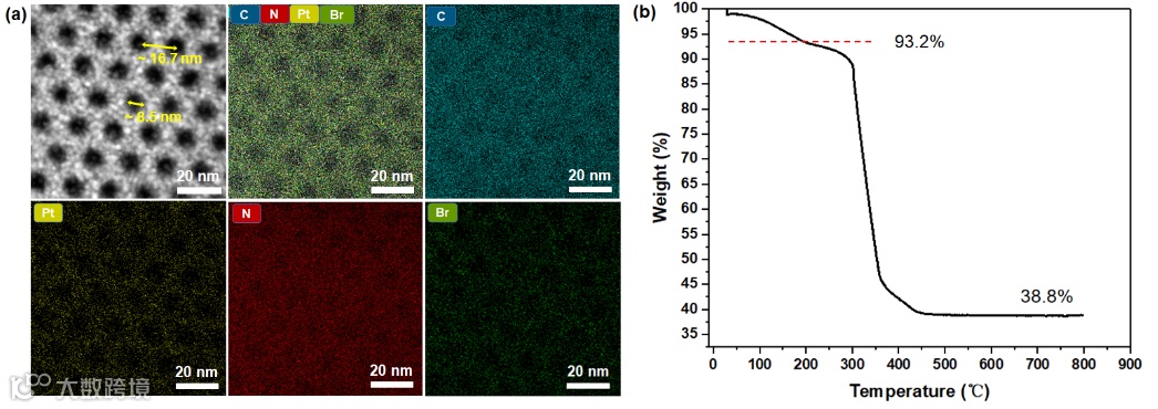 Figure 3. a) A dark field HRTEM image of a Pt NP-loaded MCMP and corresponding element mapping images; b) The TGA curve of Pt NP-loaded MCMPs in air with a temperature range of 30-800℃.
