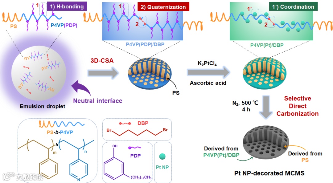 由于超分子的可逆弱相互作用(即氢键),其氢键供体PDP可以很容易地从连续相(P4VP)中去除,为随后通过“客体”交换对Pt前驱体的吸收提供了空间。由于P4VP与预交联剂(DBP)之间的强季铵化作用,预交联策略可以保持预形成的BCP微球结构的完整性。同时,本文还对这种独特的各向异性BCP微球的形成过程和机理作出了解释。