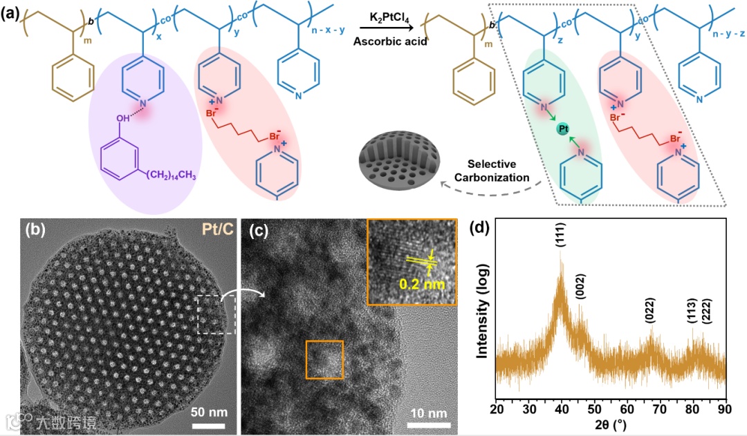 本研究中的模板微球,即PS-b-P4VP(PDP)/(DBP)微球的一个关键特征是,它们的连续相包含活性吡啶基团,可以选择性地与功能性物质交联,如与Pt NPs交联。同时,由于预交联作用,在Pt NPs的前驱体溶液渗透进入模板球当中时,它们的形态可以很好地保持。通过选择性自模板直接碳化策略,从交联的连续相中获得复合MCMPs,而分散相(PS)通过煅烧形成孔道。同时,Pt NPs的载量对P4VP的交联度和残碳率至关重要,可以通过改变给料比(K2PtCl4)相对于吡啶环的摩尔比来调节。