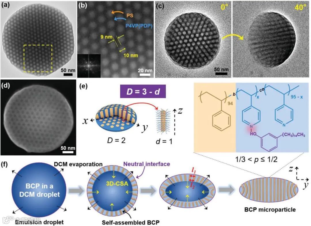 在本研究中,将超分子策略与中性界面策略结合,采用嵌段共聚物聚苯乙烯-聚(4-乙烯基吡啶) (PS-b-P4VP)和3-十五烷基苯酚(PDP)复合的梳妆超分子聚合物,通过乳液溶剂蒸发诱导的3D受限自组装(3D-CSA)形成目标微球。同时,引入了选取1, 5-二溴戊烷(DBP)作为P4VP的预交联试剂。