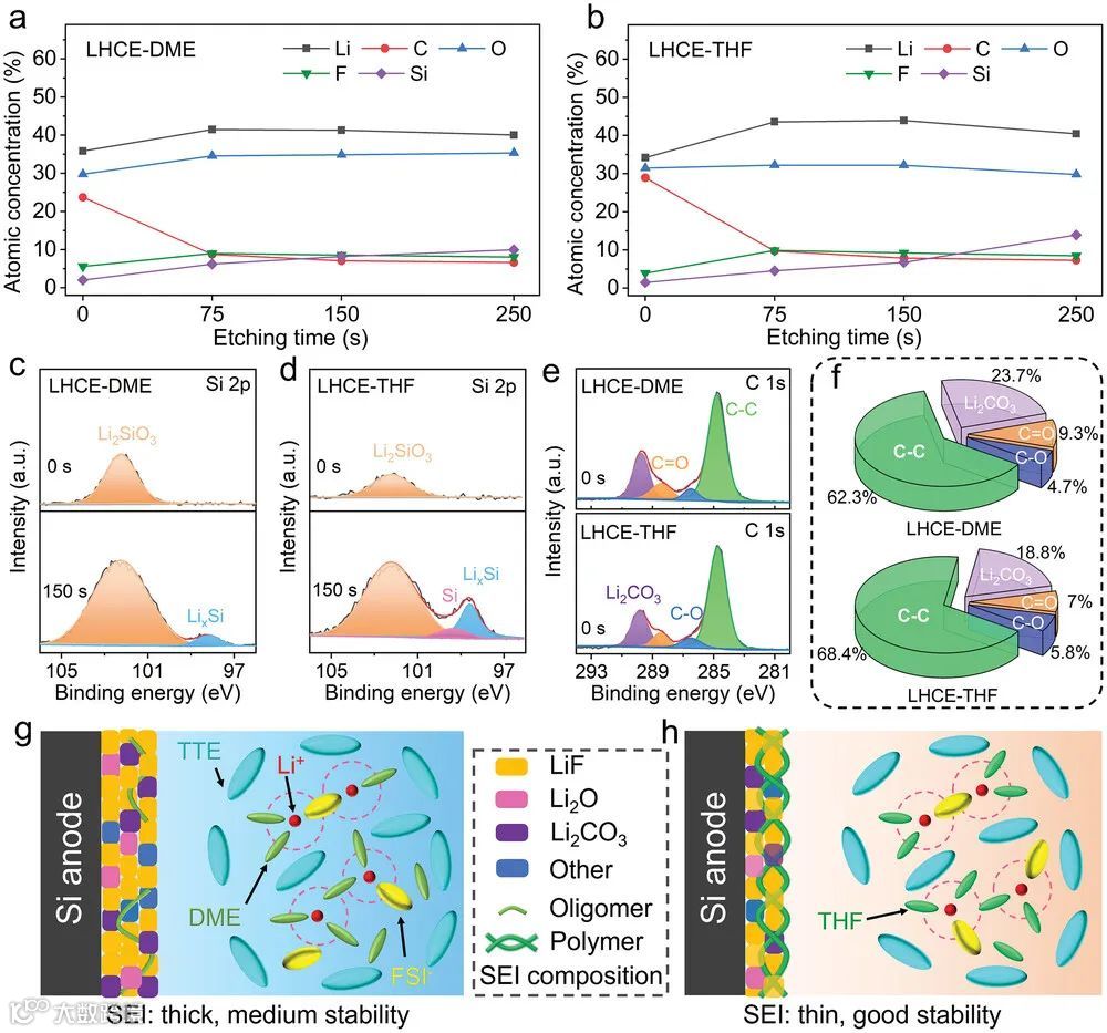 由于相似的电解液体系,LHCE-THF和LHCE-DME衍生的SEI中都存在大量的无机产物LiF。而在LHCE-THF中生成的SEI膜更薄,有机成分更多,这与THF易聚合相对应。