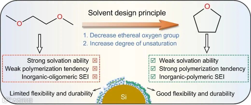 SEI膜的性质由其组成和结构决定。一般认为,SEI膜呈现出内层无机物为主、外层有机物为主的结构。研究表明,富含无机物的SEI膜能够促进锂离子的均匀传输,是提高电极电解液界面性能的有效途径,特别是在新兴的局部高浓电解液(LHCE)中,其独特的溶剂化结构进一步促进了阴离子的还原分解产生大量的无机成分,使得其在锂金属负极中得到广泛研究。然而,以上的研究往往忽略了外层有机成分的作用。不同于金属锂箔负极的沉积/剥离的电化学反应模式,活性Si颗粒内在的体积膨胀会在颗粒界面处产生较大的应力积累,一旦SEI膜无法承受应力的累积,就会发生破裂。因而,对于Si负极,理想SEI膜不仅应由富含无机物的物质组成,以提供良好的离子传输性、电子绝缘性和机械强度,还应包括高弹性聚合物外层,以适应硅颗粒的体积变化,保持界面结构的完整性。