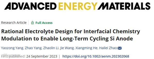 Yang, Y.; Yang, Z.; Li, Z.; Wang, J.; He, X.; Zhao, H. Rational Electrolyte Design for Interfacial Chemistry Modulation to Enable Long‐Term Cycling Si Anode. Adv. Energy Mater. 2023.