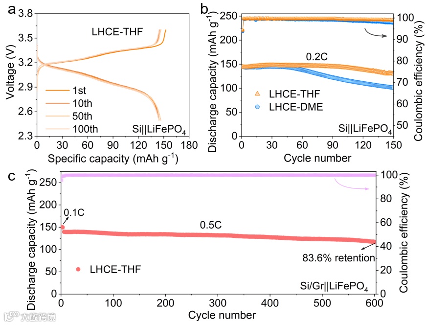 在半电池测试中,与LHCE-DME和常规的碳酸酯电解液(RCE)相比,Si在LHCE-THF中表现出最高的首次库仑效率、优异的倍率性能和长循环性能。此外,在全电池测试中,LHCE-THF表现出更为优异的循环稳定性,其中在与石墨负极复合后,Si/Gr||LiFePO4全电池在0.5C的倍率下循环600次仍保持83.6%的比容量。这些结果说明THF与Si负极的适配度最高,这与其独特的分子结构有关:首先,单醚氧官能团弱化了其溶剂化能力,促进阴离子还原分解,产生较多无机产物;其次,不饱和的环状结构易于发生开环聚合反应,产生高度聚合的长链有机聚合物。富含无机成分的SEI膜可以促进锂离子在界面处的传输,加快电极反应动力学;有机聚合产物可以增加SEI膜的弹性,使其充分适应Si的体积变化而不产生破裂,维持电极结构的稳定。