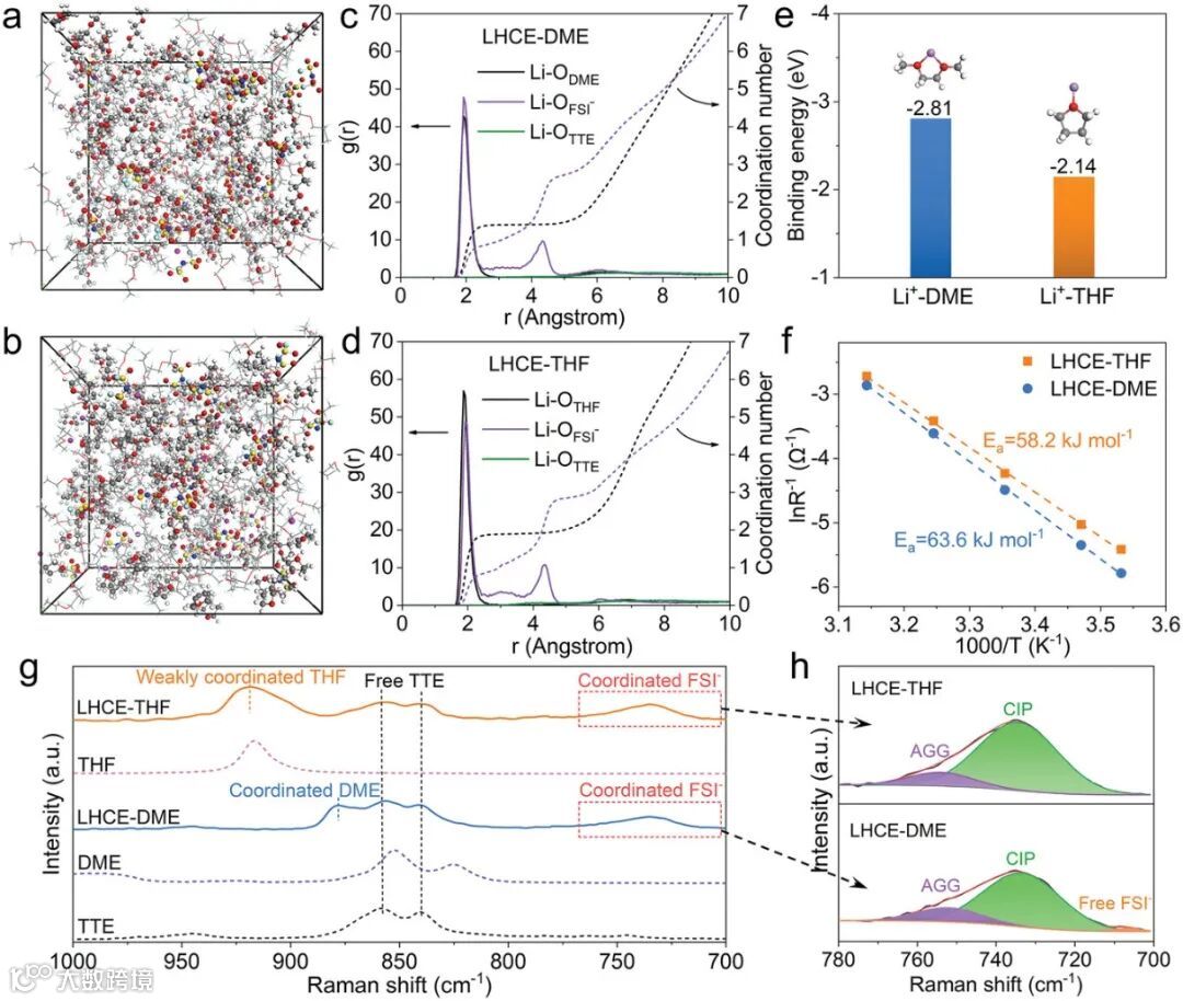 与DME相比,THF分子中只有一个能与锂离子配位的醚氧官能团,因而表现出较弱的溶剂化作用,有利于促进锂离子的脱溶剂化过程。同时,THF较弱的溶剂化能力促进了阴离子与锂离子的配位,电解液中存在大量的接触离子对(CIP)和离子聚集体(AGG),有利于阴离子的还原分解,生成富含无机成分的SEI膜。