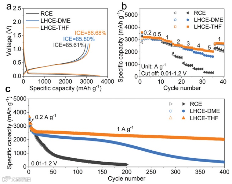 本文报道了一种与Si负极高度适配的基于环状醚THF溶剂的电解液体系,突出了SEI膜外层有机成分的高聚合度和弹性对其结构稳定性的作用。与DME相比,THF具有较弱的溶剂化能力,能够促进锂离子的脱溶剂化动力学以及阴离子的还原分解,生成富含无机成分的SEI膜;同时,不饱和的环状结构使得THF更容易发生开环聚合反应,生成高弹性的有机聚合物长链,进一步维持SEI膜和电极结构的稳定。因而,Si负极在LHCE-THF中表现出优异的电化学性能。