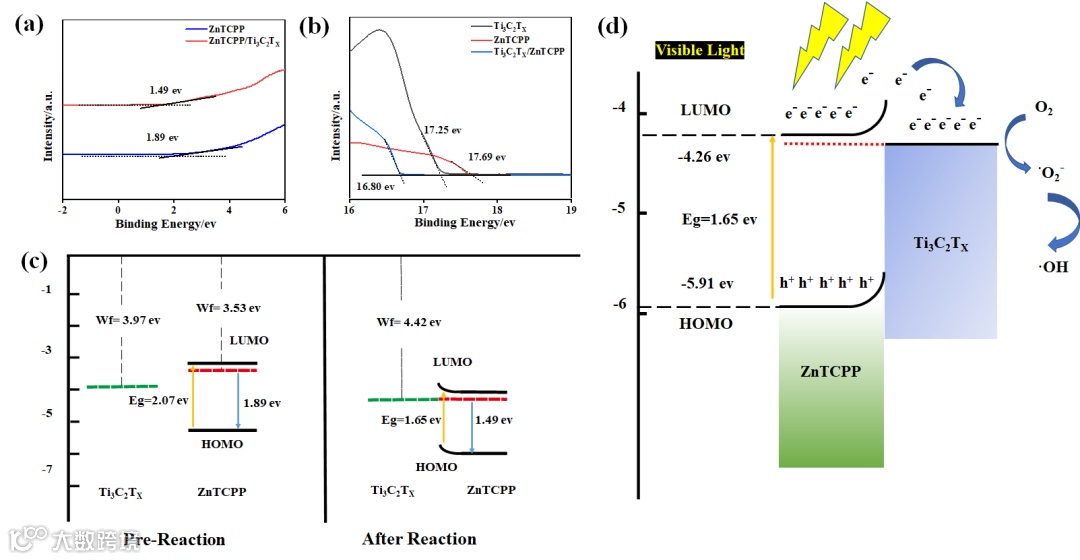 图2. Ti3C2TX、ZnTCPP和ZnTCPP/Ti3C2TX的UPS光谱及 ZnTCPP与Ti3C2TX接触后光催化提升机制。