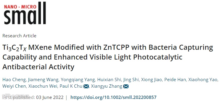 文章以“Ti3C2TX MXene Modified with ZnTCPP with Bacteria Capturing Capability and Enhanced Visible Light Photocatalytic Antibacterial Activity”为题发表在了国际权威期刊Small上。太原理工大学张翔宇副教授和香港城市大学朱剑豪教授为共同通讯作者,太原理工大学博士生程昊为第一作者。