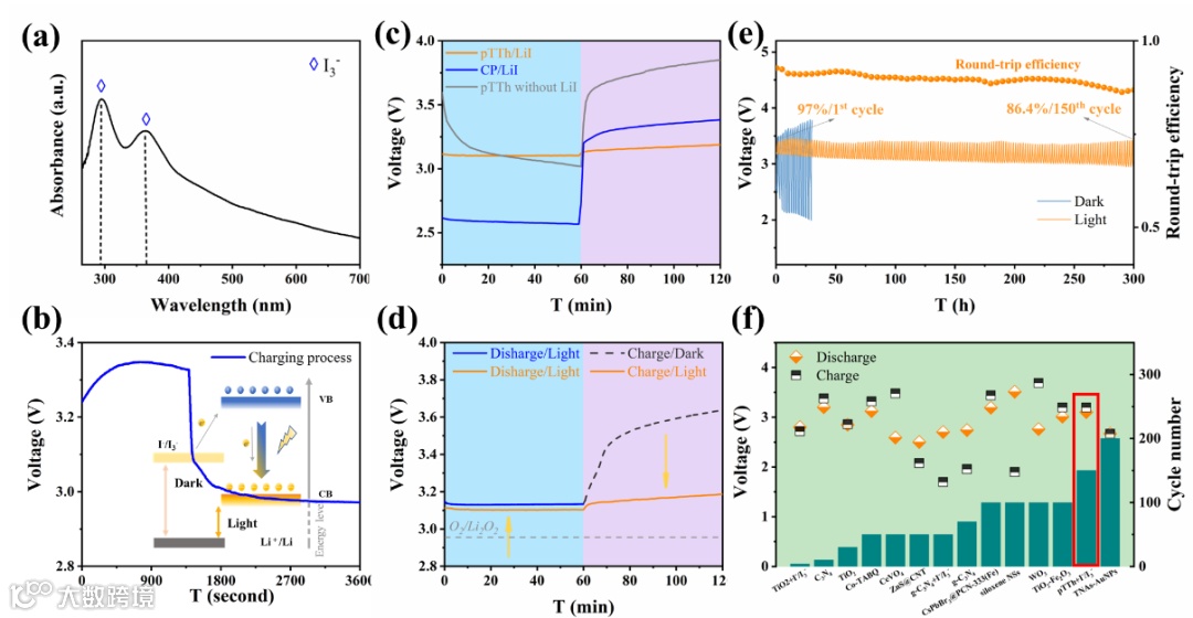 作者通过引入LiI作为锂-氧气电池的氧化还原介质,在充电过程中检测到I3-的信号。相较于无光下的电池,放电平台提升到3.1 V,充电电压降低到3.19 V,并且这一电位明显低于无光下含LiI的电池,说明光电极和氧化还原介质实现了协同作用。利用I-来还原氧化环境的空穴,生成的I3-进而化学氧化放电产物Li2O2,光生空穴的电压得以降低,从而保护了电池正极和电解液,电池的稳定性大幅提高。