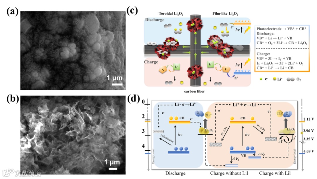 电池在光照下可以有效地调整放电产物的沉积和形貌,相较于无光下电池趋于形成大块环状的放电产物,光照时的快速电子传导会在光电极的纳米片之间形成均匀分布的薄膜状结构产物,有利于保持原有的活性中心,提升充电过程中Li2O2分解的反应动力学。光辅助锂-氧气电池的过电位显著降低,这意味着光辅助电池为光能的利用和锂-氧气电池的改进提供了一条新的途径,实现了光能向化学能,继而向电能的储存与转化,具有非常大的研究意义。