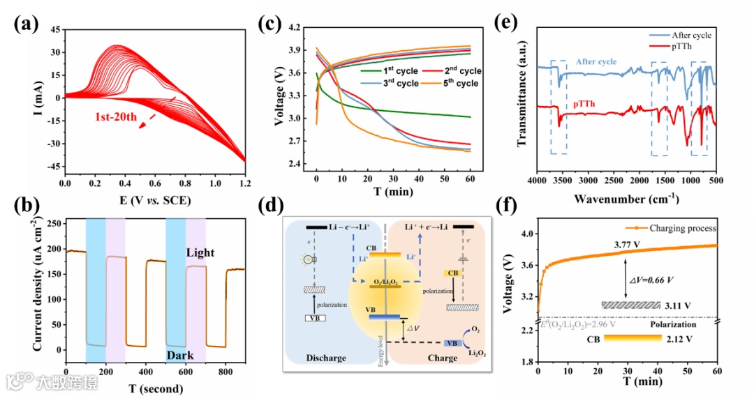 作者通过原位电聚合的方法成功合成了具有半导体性质的聚三联噻吩光催化剂(pTTh),并将其应用于光辅助锂-氧气电池的高效光电正极材料。得益于pTTh优异的ORR光催化活性,成功将光辅助锂-氧气电池的放电电压提升到了3.1 V,超过了锂-氧气电池2.96 V的平衡电位,实现了光能向化学能的储存。但是受限于充电过程中高氧化电位空穴的威胁,电极在充电过程中发生结构变化,影响了后续光催化效能。
