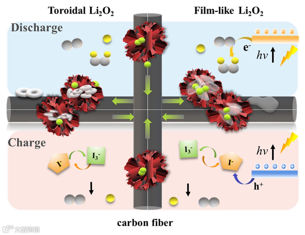图1. 含有LiI的光辅助锂-氧气电池反应机理图。