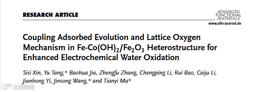 基于此,昆明理工大学王劲松副教授、皇家墨尔本理工大学马天翼教授和云南师范大学唐语博士(共同通讯作者)等人在国际知名期刊Advanced Functional Materials上发表题为“Coupling Adsorbed Evolution and Lattice Oxygen Mechanism in Fe-Co(OH)2/Fe2O3 Heterostructure for Enhanced Electrochemical Water Oxidation”的研究论文。