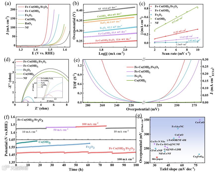 图3. Fe-Co(OH)2/Fe2O3异质结构的OER催化活性