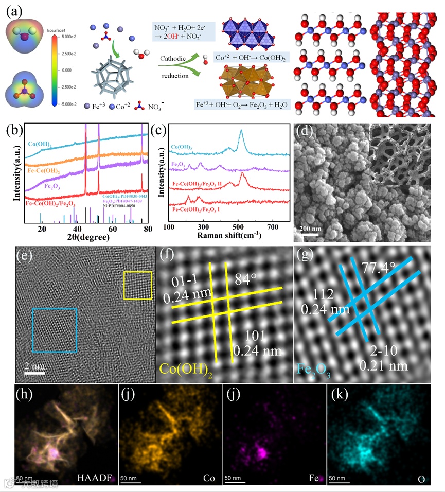 本文采用简单的一步电化学沉积法制备出异质结构的Fe-Co(OH)2/Fe2O3纳米复合材料。NO3-的还原形成局部碱性环境,有利于Co(OH)2的合成,Fe3+倾向于通过Fe3++O2+OH-→Fe2O3+H2O形成Fe2O3,进而构建异质结构。XRD图谱和Raman表明,Co(OH)2/Fe2O3由Co(OH)2和Fe2O3两相构成,进一步TEM观察出Fe-Co(OH)2/Fe2O3界面结构。