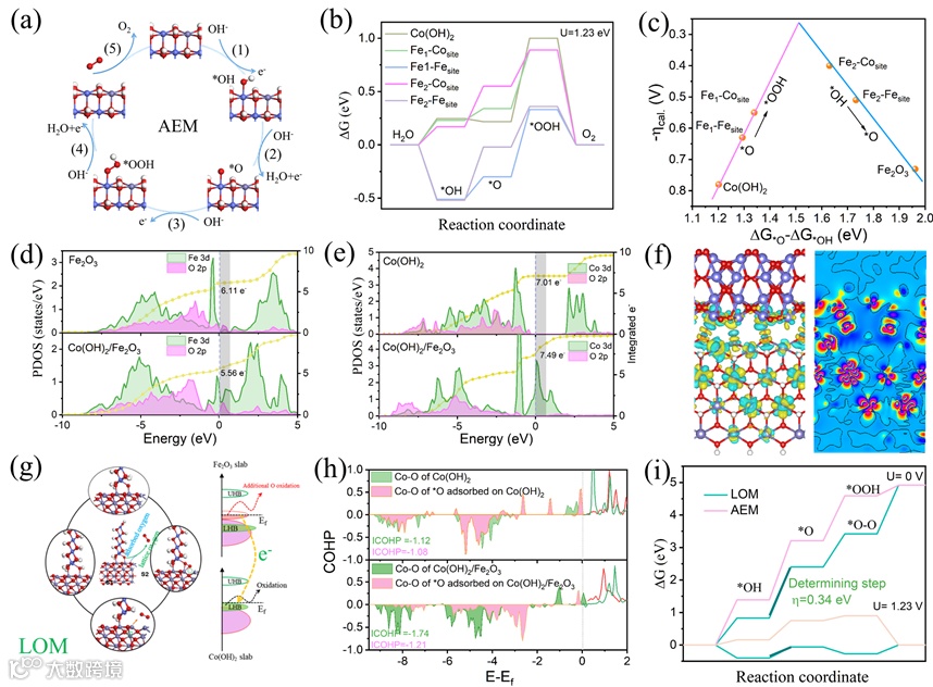 本文提出了一种Fe-Co(OH)2/Fe2O3异质结构的表面模型催化剂,其中遵循AEM机制的Fe-Co(OH)2可以完成快速去质子化过程,而LOM机制的Fe2O3可以触发O-O耦合步骤。DFT理论计算和电化学探针实验研究表明,AEM和LOM的耦合的Fe-Co(OH)2/Fe2O3异质结可实现空间电荷的重新分配,协同优化吸附氧和晶格氧,打破传统AEM吸附能线型关系约束,理论过电势得到明显降低,同时促进OER活性和稳定性。