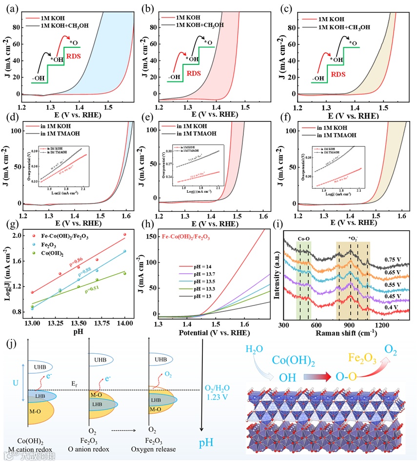 采用甲醇氧化、四甲基铵根离子检测、pH依赖性等电化学探针实验,以及原位Raman等证实Fe-Co(OH)2/Fe2O3异质结构在电催化途径中的双机制耦合机理。具体的,甲醇氧化实验证实了界面的建立成功调控了Fe-Co(OH)2/Fe2O3对中间体*OH的吸附能的调控。pH依赖性、四甲基铵根离子检测和原位拉曼证实了Fe-Co(OH)2/Fe2O3可以平衡AEM和LOM,从而协同提高OER活性和稳定性。