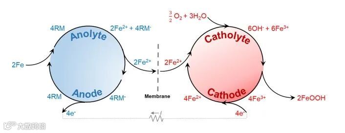 2Fe+4RM → 2Fe2++4RM- (In anolyte tank)